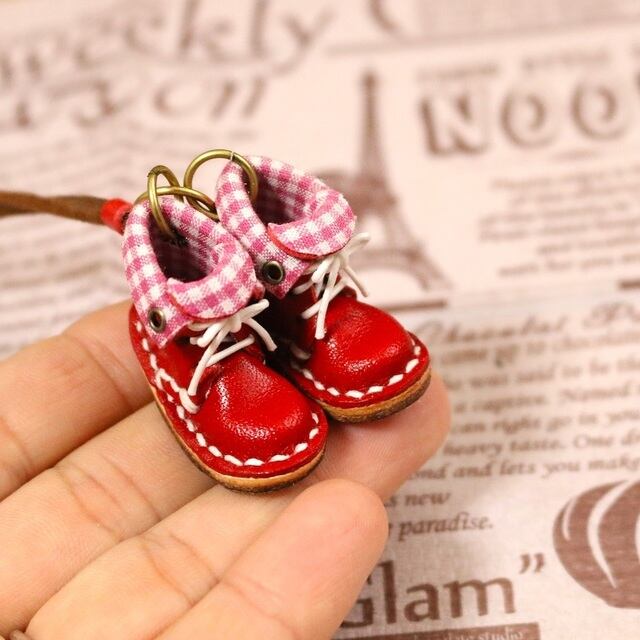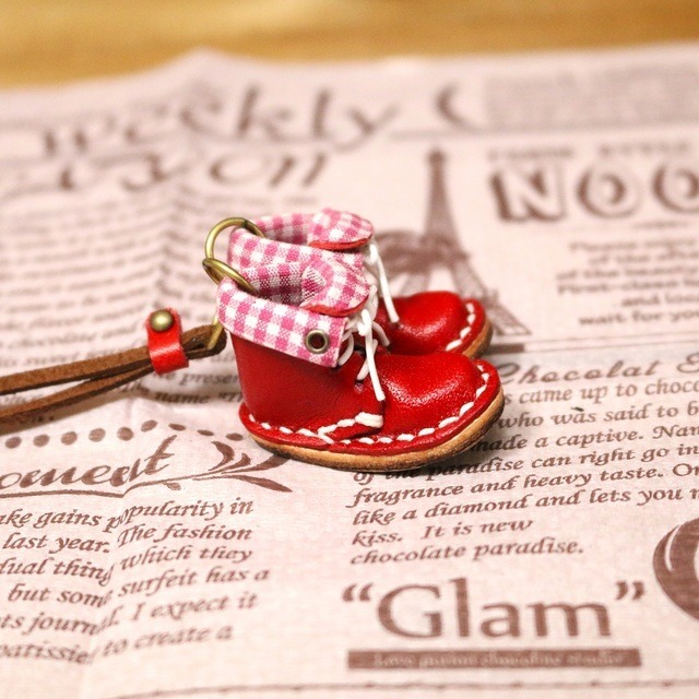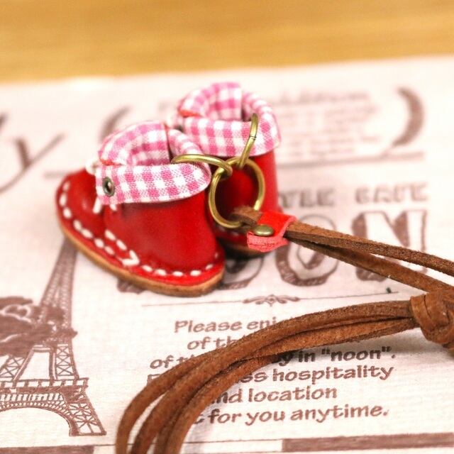 小さな革ブーツのネックレス|ストロベリー裏地付
